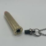 Handmade bullet capsule necklace made from once live round that has been taken apart and the powder has been removed and the primer deactivated. The back end can be unscrewed and ashes or whatever you are looking to put inside can be inserted and the back can then be threaded closed. We suggest putting a drop of Loctite or super glue gel on the threads before closing. The nickel version won’t tarnish over time as the brass will.