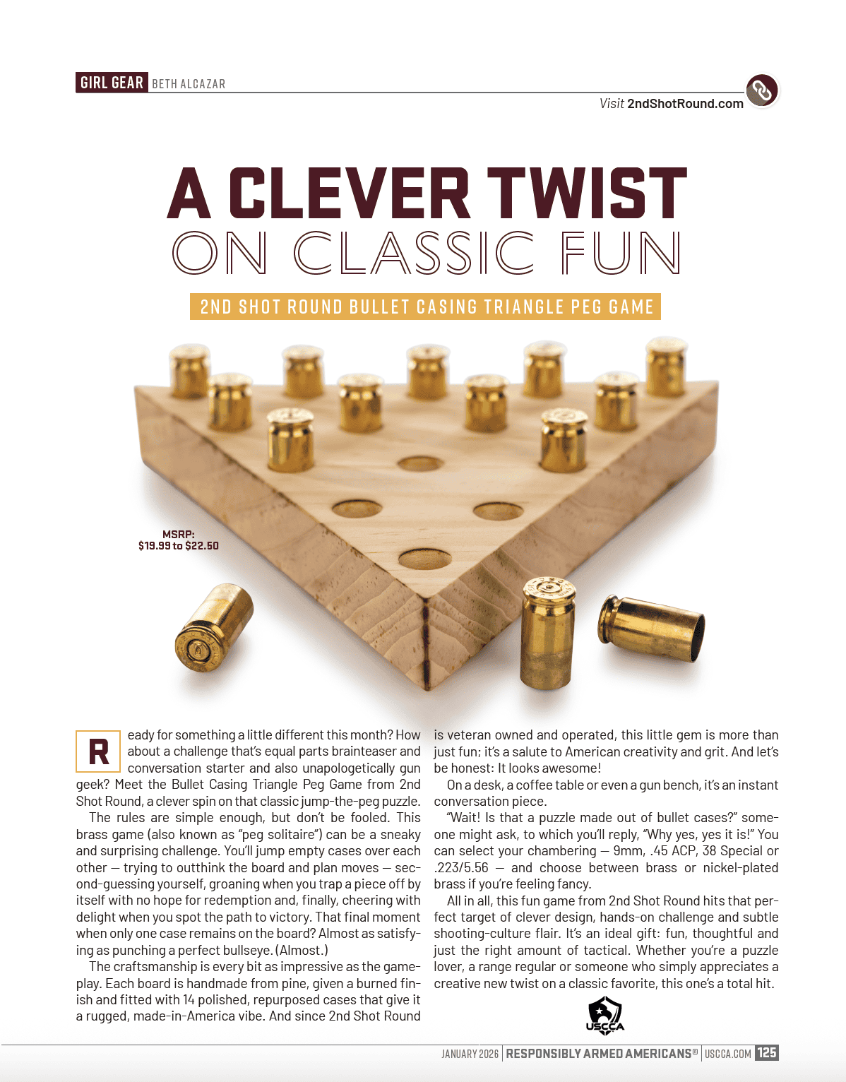 This classic Cracker Barrel golf tee/peg game has a spin taken on it and is made with the caliber casings of your choice. The board is made from pine and has been given a burned finish. The board is about 6″ wide and comes with 14 polished casings for game pieces. Perfect for that brain teaser in your man cave, at a bar, or at your desk at work. Always an awesome unique gift for that smart guy you know who already seems to have everything. *Featured in the “Responsibly Armed Americans” magazine by USCCA (January 2026 issue)*