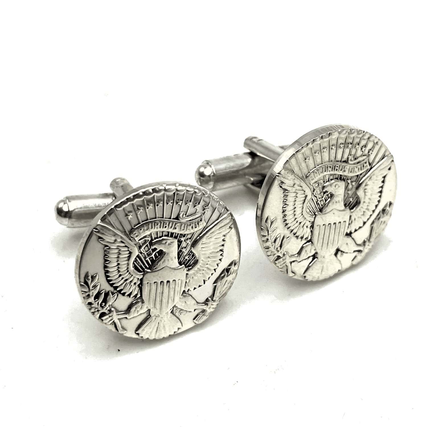 Handmade cufflinks made from real Kennedy Half Dollars. Perfect for the high class moments in life. These are made from the centers of the half dollars the have been punched out when making rings. We offer them in copper nickel clad (made from circulation half dollars) or 90% silver (made from 1964 or proof silver half dollars).