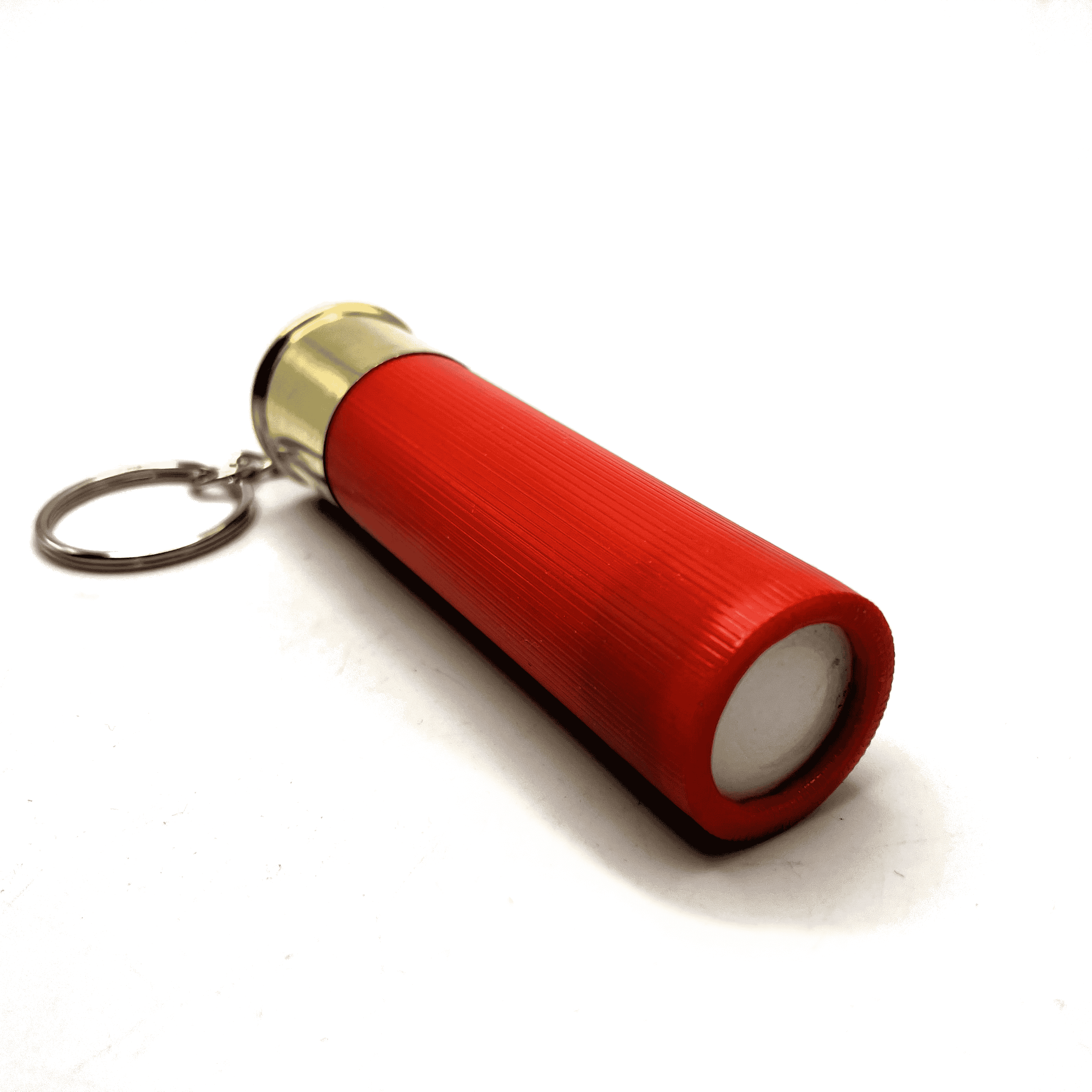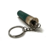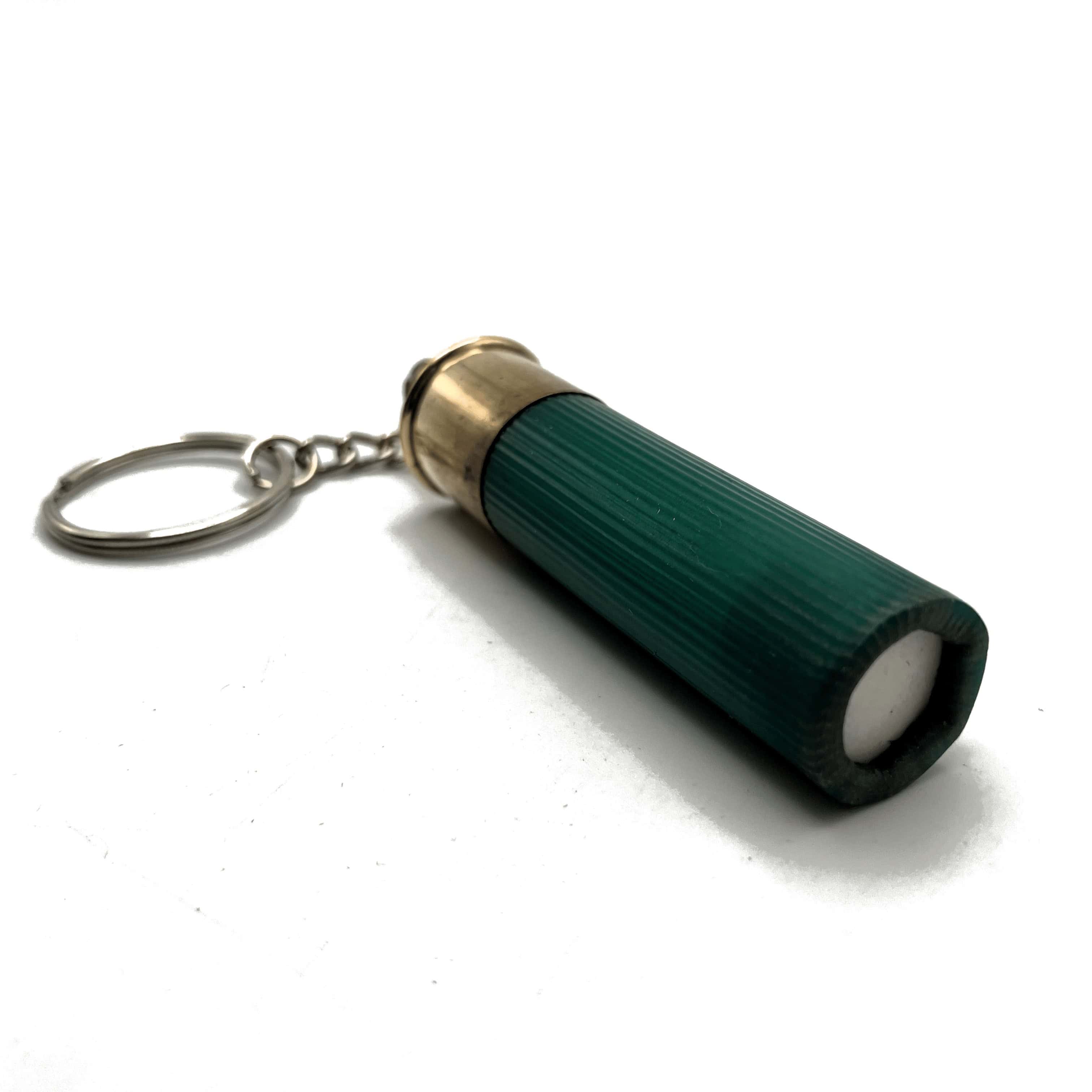 Handmade shotgun shell keychains made from fired shotgun shell that have been salvaged.