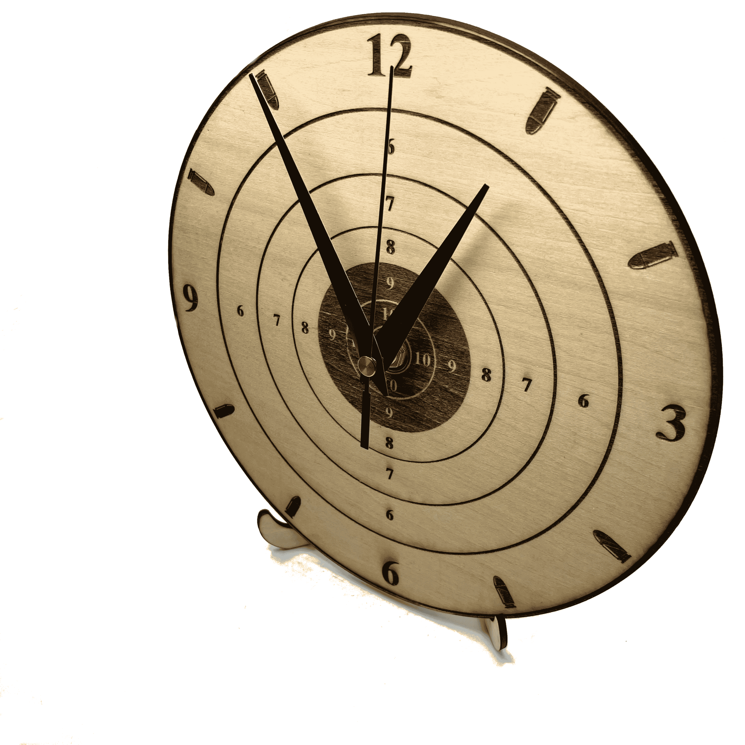 8 Inch target clock laser engraved design. The 4 main hours are marked with numbers and all the hours in between are marked with engraved pistol bullets. Clock is silent (no ticking). Clock comes with a hanger as well as a free stand so you can either hang it on the wall or place it on a table.